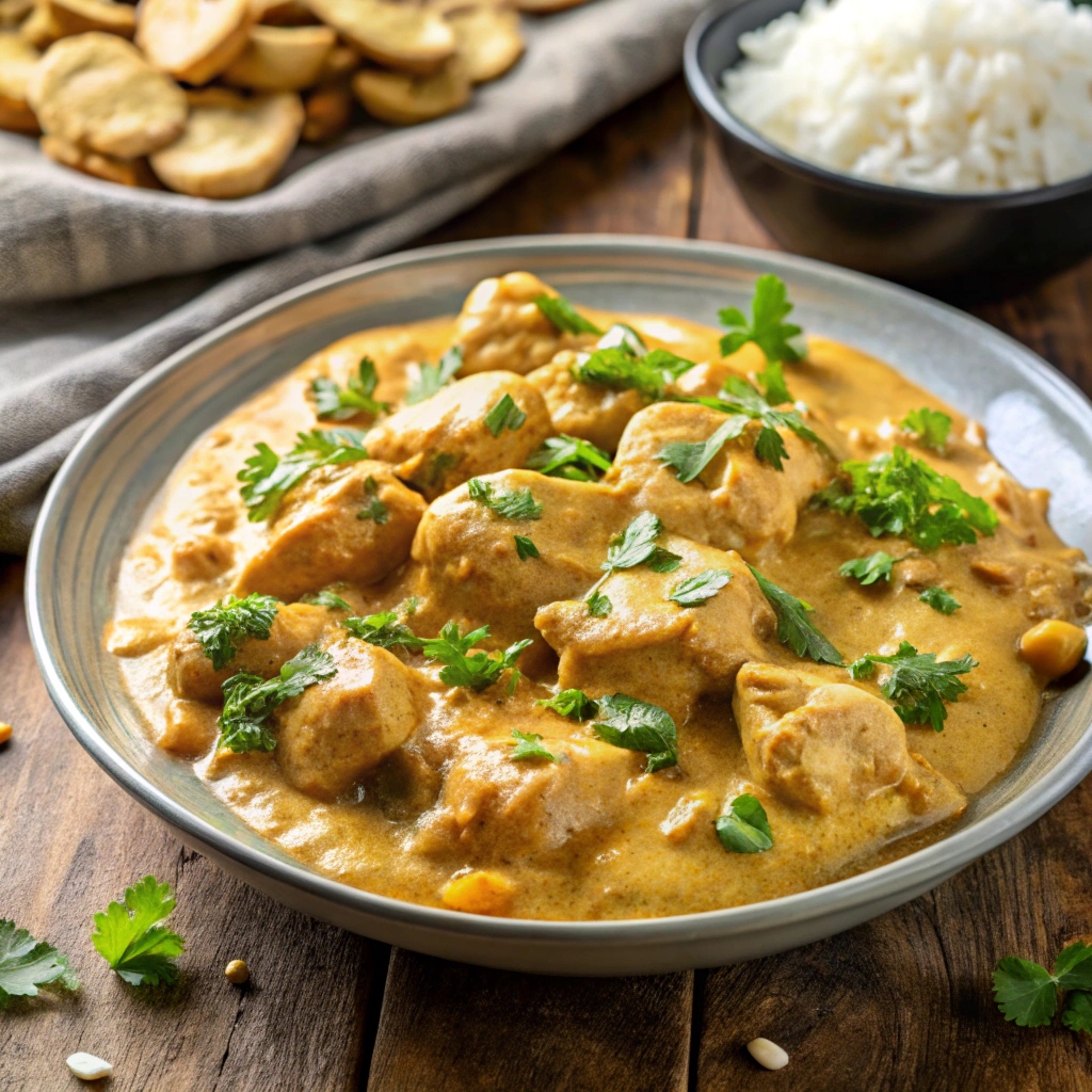 Chicken Korma Chicken Korma Tender chicken cooked delicately in a seasoned cream based curry with cashew nuts